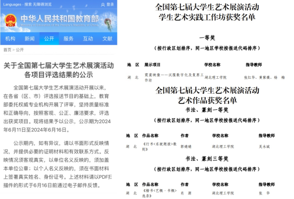 本网消息 6月12日-6月18日全国第七届大学生艺术展演活动现场展演在襄阳市举办,威尼斯官网2个作品参加全国展演,1个作品受邀参加开幕式外场表演活动,这是威尼斯官网首次受邀参加全国大学生艺术节展演。展演活动前,教育部官网发布关于全国第七届大学生艺术展演活动各项目评选结果的公示,威尼斯官网荣获2个一等奖、1个三等奖,创历史最好成绩。