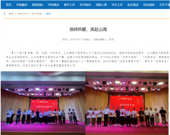 为了更好的引领同学们成长,充分发挥党员的先锋模范作用,该党支部在党员中设立学习先锋、技能先锋、行动先锋、模范先锋、志愿先锋等先锋岗位,引导学生敢于亮出党员身份、立起先进标尺、树立先锋形象。充分发挥身边典型示范作用,邀请了优秀党员校友中国一冶天津公司总经理高伟回校分享成长故事,邀请业界多名精英到校传授成功经验,宣传学习土建优秀学生党员“中国年度大学生自强之星”石文武、“黄石市级优秀学生干部”汪涵、“黄石市优秀学生”王芳舟、“黄石市优秀学生共青团员”石晓通以及学生陈万三在校外拾金不昧的传递土建正能量事迹,开展每年度优秀毕业生风采展示,开展每年度“榜样引领、创新争优”表彰大会,每年3月开展“土建雷锋”评比活动,每年12月开展“党员先锋”评比活动,让同学们形成比学赶超、奋勇争先的良好氛围,切实发挥党员先锋模范作用。组织实施帮扶举措,包括党团帮扶、宿舍帮扶等帮扶措施,提供充分发挥党员先锋作用的平台,强化榜样引领,通过帮扶举措,学生文明宿舍大幅增加,学院连续两年获得学校“文明宿舍”。