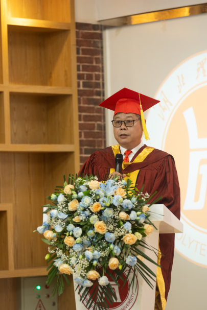国际学院院长李莉以“持之以恒牢记初心心怀感恩做中外文化交流的使者”为题寄语毕业生:坚持很难,坚持下去一定很酷;健康所系,始终坚守医者仁心;爱校荣校,做好中外交流的使者。