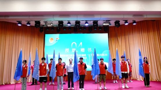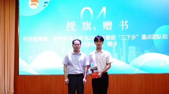 涂立桥副校长为2024年暑期“三下乡”重点团队和团队代表授旗、赠书,并宣布出征。