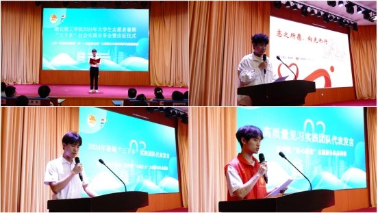 国际学院“童乐”志愿服务队彭锦朕同学、医学院“医心医意”志愿服务队苏伟伟同学分别代表2023年暑期“三下乡”优秀团队、高质量见习实践团队作经验分享,电气与电子信息工程学院心曦之火志愿服务队朱浩凯同学代表2024年暑期三下乡实践团队作表态发言。