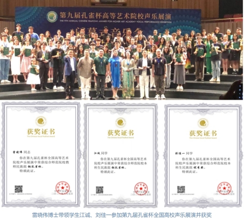 同时,雷晓伟博士带领学生江诚、刘佳一参加第九届孔雀杯全国高校声乐展演,均获奖,参加湖北省中青年表演艺术大赛,获三等奖。