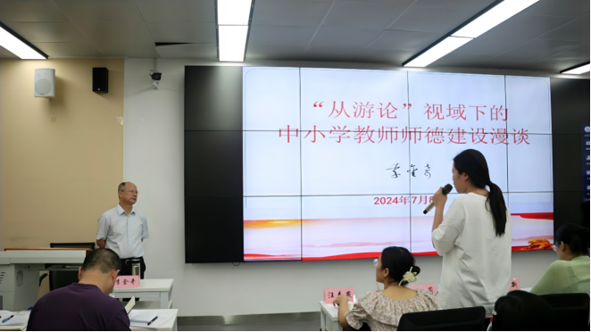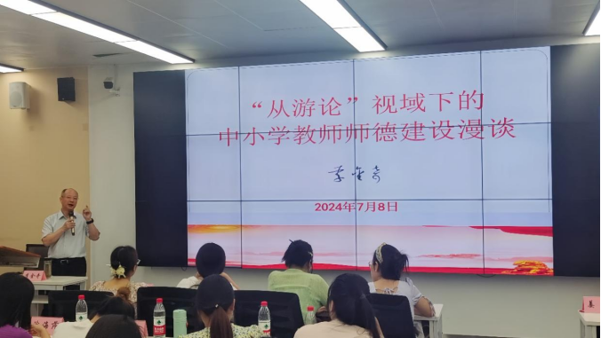 本网消息 7月8日上午,国培计划(2024)黄石市农村小学数学骨干教师培训第一讲正式拉开帷幕。党委副书记李金奇教授以“‘从游论’视域下的中小学教师师德建设漫谈”为题作了精彩讲座,师范学院院长胡邦岳、副院长谢晨、国培班班主任熊明、袁小然老师以及全体学员参加培训。
