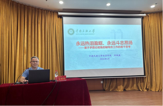7月10日上午,中南民族大学经济学院学生工作办公室副主任安树庭,以《永远热泪盈眶、永远斗志昂扬——基于矛盾论视角的辅导员工作的若干思考》为题,强调辅导员要提高政治能力,并从用矛盾的观点认识岗位职责、用斗争的思维培育职业素养、用榜样的力量提高工作成效三个方面,介绍了矛盾论思维在处理学生工作案例中的应用,分享了辅导员工作的“一二三四”原则,并鼓励辅导员向榜样学习,并敢于成为学生的榜样。
