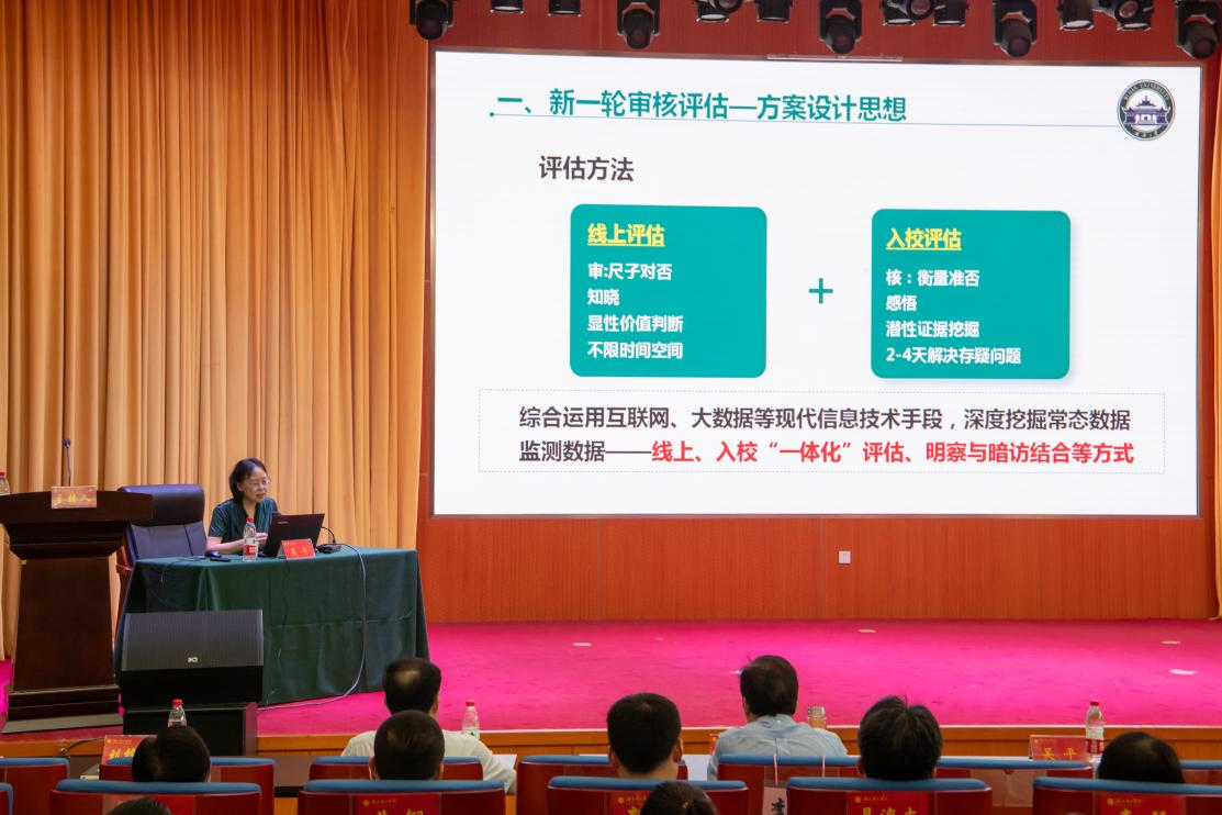 吴平以“新一轮审核评估方案解读”为题,结合她深邃的教学管理智慧和评估实践工作经验,详细解读了新一轮审核评估的方案设计思想、分类方案设计、评估程序以及指标内涵等。吴平还对威尼斯官网审核评估工作提出了建议:一是要认真理解审核评估工作的意义与要求,进一步审视学校存在的问题,谋划和落实好下一步整改举措;二是要注重过程评价,形成多维立体的视角,构建全链条、多维度的教学质量评价体系;三是自评报告要做好自我画像,并突出人才培养服务行业、服务地方经济的贡献和影响;四是要把审核评估作为提高办学质量的重要路径,在体制机制改革、课程体系改革、教学方法改革等重点领域取得新进展,实现改革新突破。