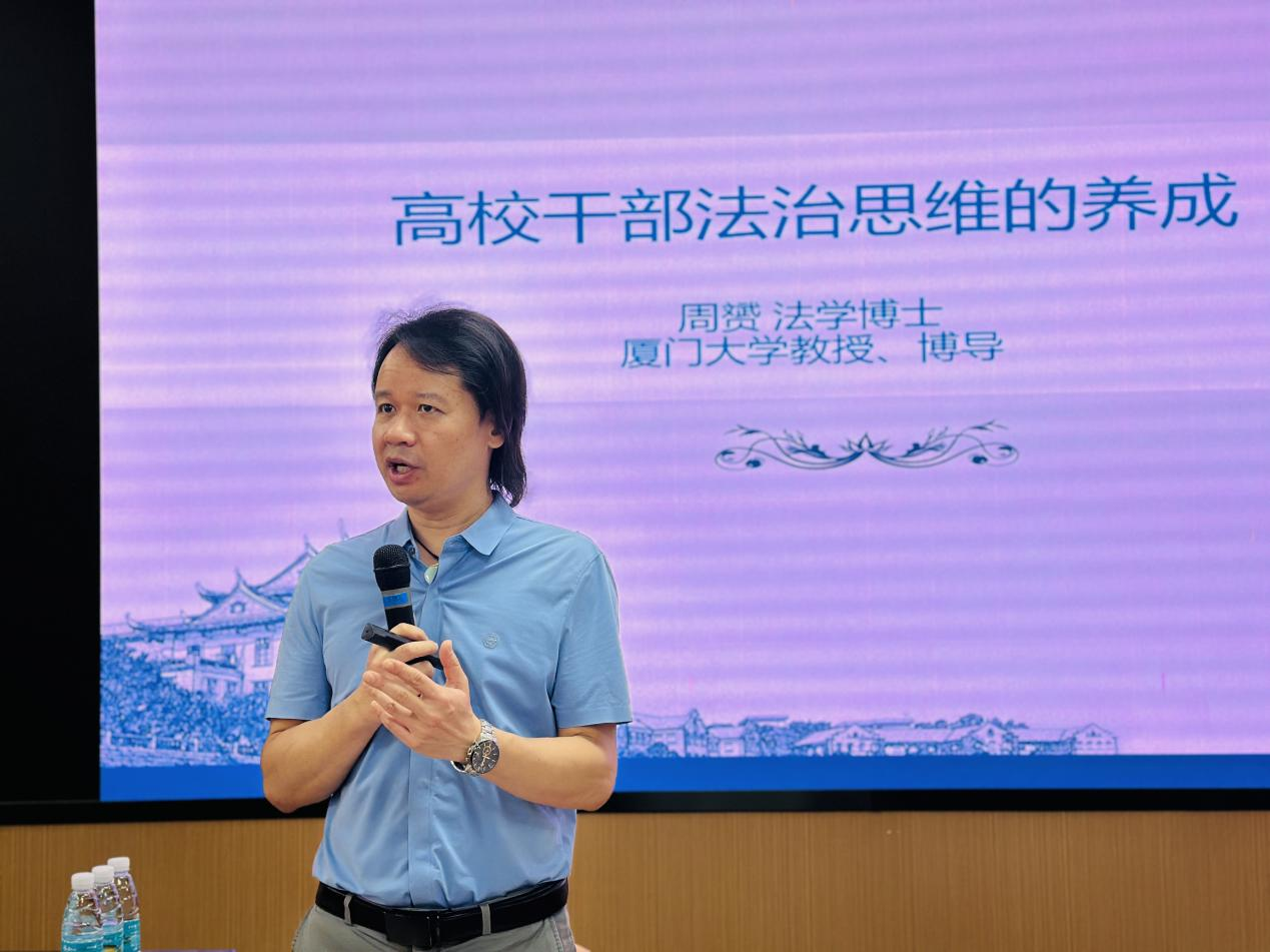 厦门大学法学院教授周赟以《高校干部法治思维的养成》为题,从“不思”的习惯和“思”的态度正反两个方面,介绍新时代背景下,领导干部如何牢固树立法治意识,进而培养法治思维、提升法治能力。