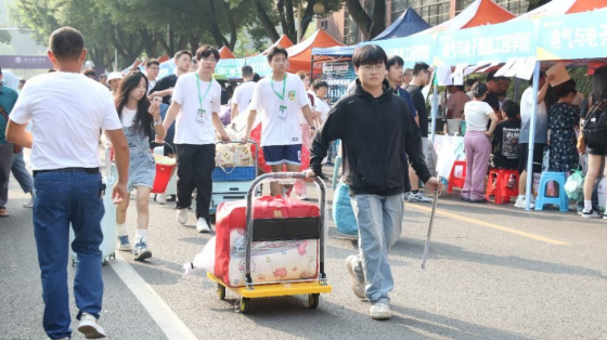 在入学大门后方,各学院早早搭好帐篷,学长学姐们以饱满的热情和体贴的服务等待着学弟学妹们的到来。新生报到处的工作人员们认真确认每一位新生的入学信息无误,保障每一位新生顺利完成入学报到;各学院为迎接新生“各出新招”:帐篷旁的打卡墙,地上活灵活现的机器狗,桌上免费提供的矿泉水和绿豆汤……仪式感满满,拉近了新生与学校的距离,消除了新同学的陌生感。
