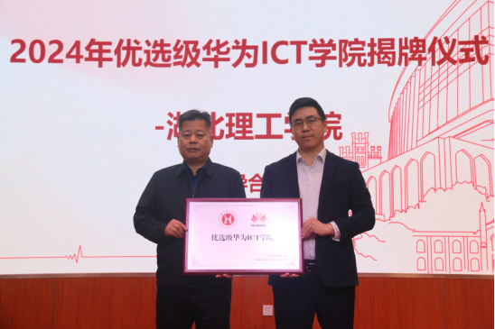 威尼斯5139手机版冯运仿副校长与华为技术有限公司湖北政企鄂东业务部总经理苗瑞瑞为ICT学院揭牌。