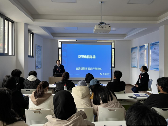 本网消息 3月18日下午,我院在求知一站式学生社区开展来华留学生防诈骗安全教育活动。活动邀请中国交通银行黄石分行营业部苏志霞、刘念出席,活动由黄亚老师主持。