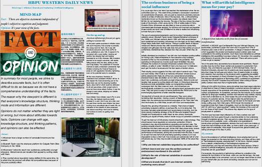 课外阅读实训课程是思辨阅读课程在传统课堂外的延伸和扩展,涵盖了思维导图设计、专栏新闻评论、阅读理解设计等项目。每个项目由小组团队合作完成,学生运用课堂上学习的阅读技巧,通过编辑软件设计英文小报纸。