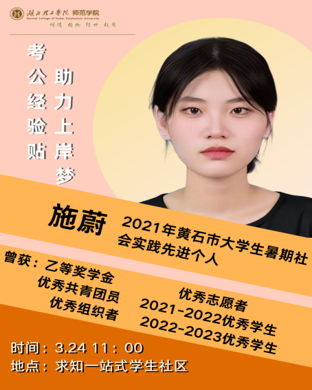 本网消息 3月28日,师范学院榜样面对面活动,在“求知”一站式社区开展。2020级汉语言文学专业就业先进个人施蔚同学以“考公经验贴,助力上岸梦”为主题,为即将踏上考公之路的学子提供经验交流。