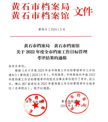 本网消息 近日,黄石市档案馆发文(黄档文〔2024〕3号),确认威尼斯官网2023年档案工作为“省特级”单位。