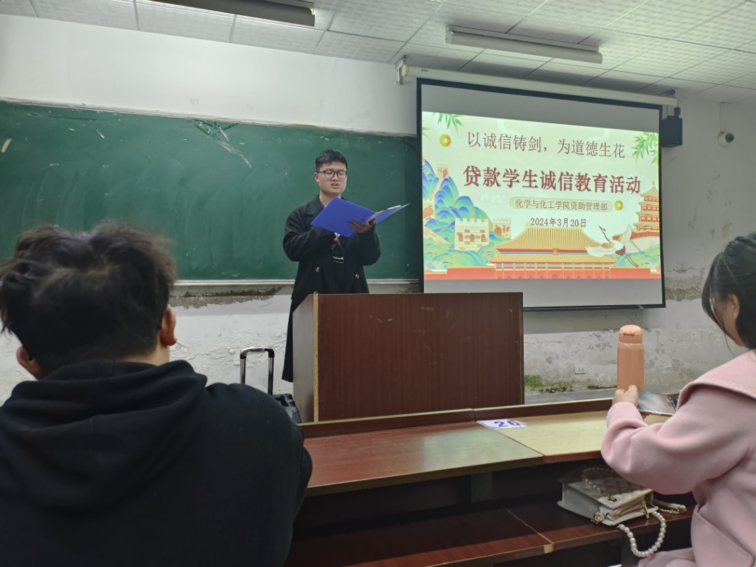 3月20日晚,化学与化工学院在J3-403开展“以诚信铸剑,为道德生花”为主题的贷款学生诚信教育活动。辅导员刘霞、资助管理部部长冯清昊详细解读了国家助学贷款的办理流程,通过观看助学贷款政策影片、解读贷款政策、优秀贷款生发言和诚信签名等环节,使同学们了解了国家征信体系和生源地贷款的还贷知识、对树立大学生的诚信、按时还贷意识起到了良好的促进作用。