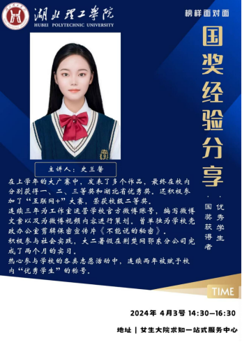 史兰馨同学从时间管理、学习方法等方面分享了她的经验。她认为,合理安排时间、制定学习计划是提高学习效率的关键。同时,她强调了团队协作的重要性,鼓励学弟学妹们多参与集体活动,学会与他人共同成长。