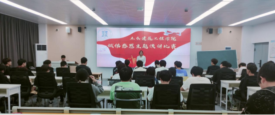 本网消息 4月18日,土木建筑工程学院在J2-309开展“诚信·感恩·成才”主题演讲比赛。比赛由金梦蕾主持,辅导员何菲菲老师和团总支学生会7名学生代表担任评委。来自各年级学生代表50余人参与了本次活动。