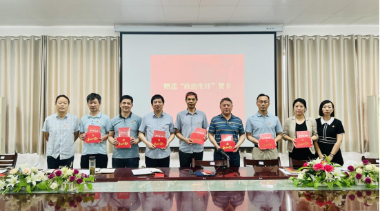 机电工程学院院长陶晶宣布“政治生日”党员名单,杨菁为其赠送生日贺卡、书籍《初心的力量》。