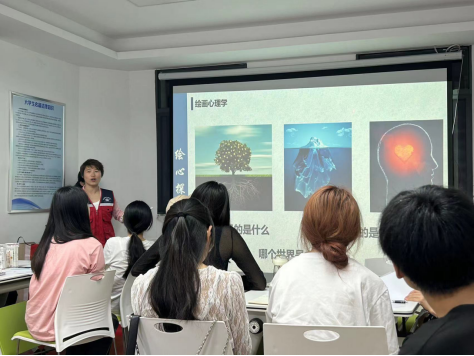 活动首先以游戏“小蜜蜂”开场,在轻松娱乐的氛围中,同学们明白了团结的重要性。主讲李老师提出绘画是心理的投射,是潜意识的显现,是过往生活片段的一帧,是我们对世界的认知。李老师通过展示绘画图片,分享绘画作品,让同学们对自己的情感有了更加准确的认知。