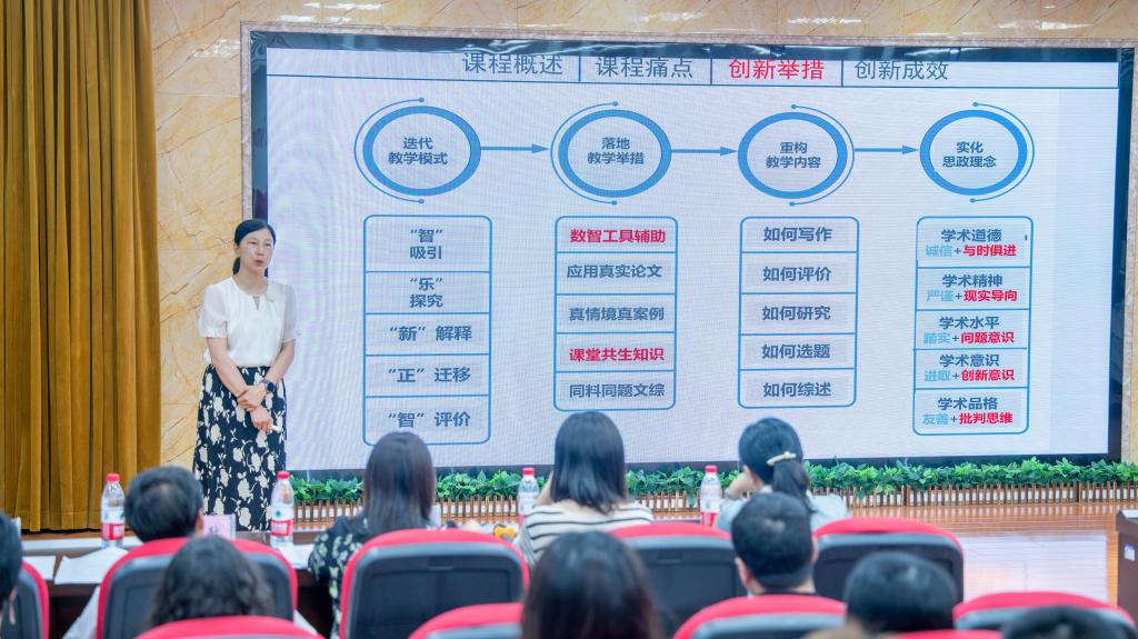 邵春美老师以“知识共生,双思为翼,能力共进,选题固基”为题,从《研究方法与论文写作》课程的教学创新与实践等方面进行汇报。她以“迭代教学模式、落地教学举措、重构教学内容、实化思政理念”作为创新举措,通过“线上阅读、线下探究、共生新知、线上评价”等形式,在“宏观指导、中观转换、微观操作”的过程当中,获得了“学生掌握方法多元化、学生提升能力多维化、学生开阔视野广角化”的创新成效。