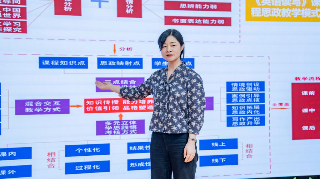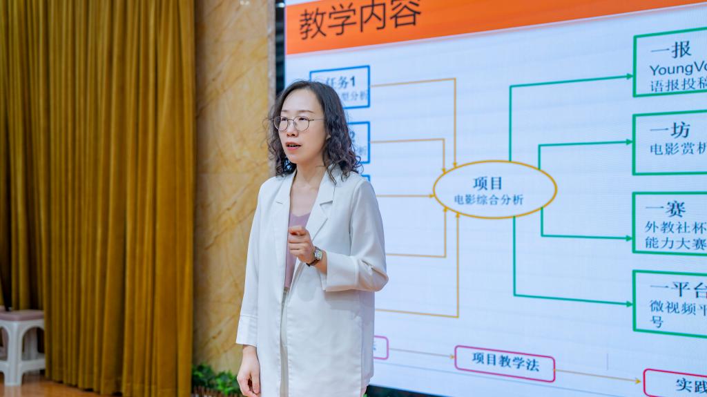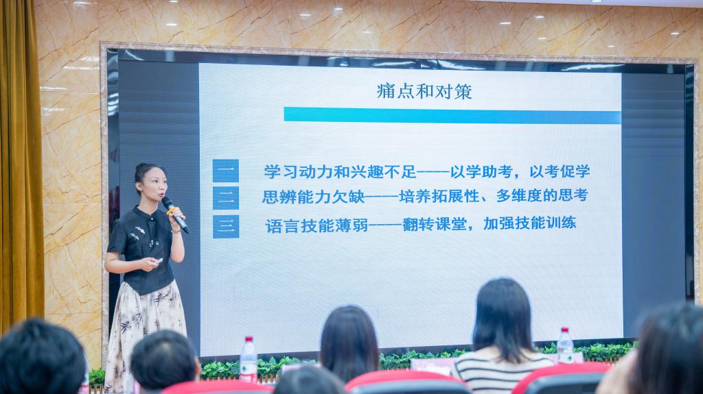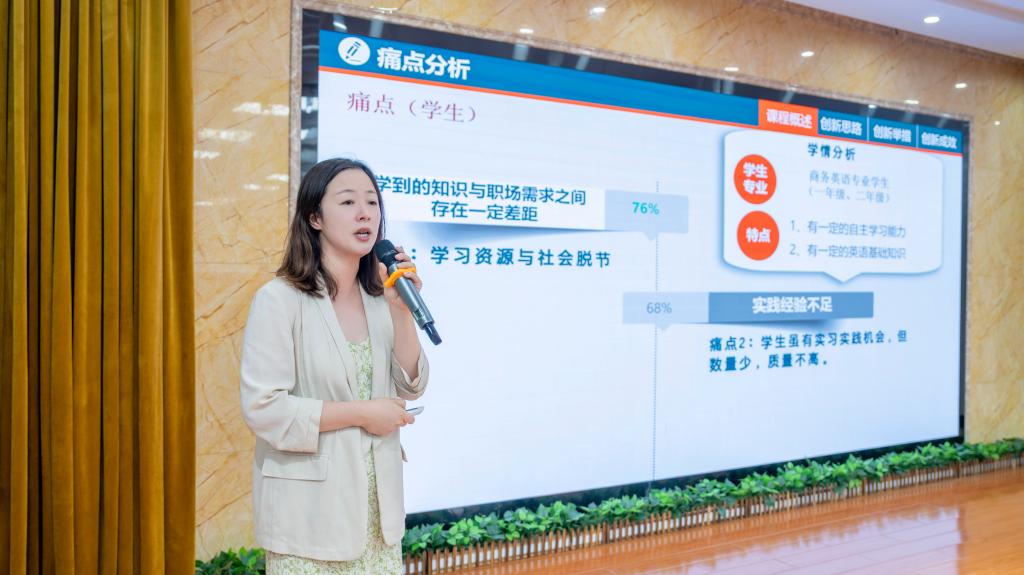 童晓岚老师汇报了《综合英语》课程教学创新设计思路。她采用项目式学习模式,通过线上线下相结合、循环翻转课堂教学,培养学生创新想法融合能力,有效促进了学生知识点巩固和成果产出。