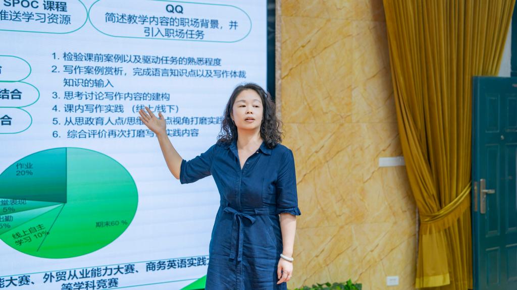 刘俊老师对《商务英语写作》课程进行教学创新汇报,她以“内容语言融合教育理念(CLI)”的“大思政格局”为创新思路,对标金课,深化和整合思政目标,以“产出导向法+情境教学法”作为创新路径,取得了良好的创新效果。