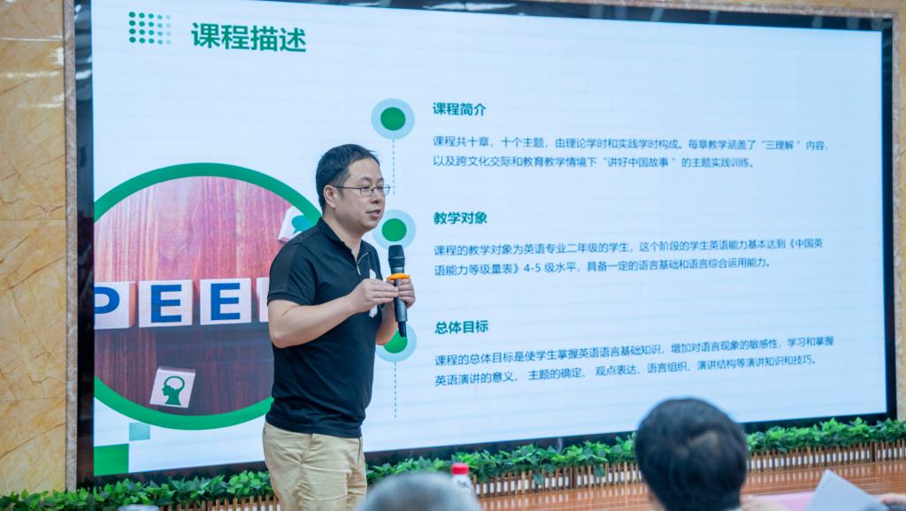 章国建老师汇报了《英语演讲》课程的教学创新途径,他以“课程思政与演讲能力训练结合、本土文化传播和讲好本土好故事作为课程创新的抓手、学生演讲能力培养和创新能力结合”为创新举措,有效提升了学生语言运用能力和融通中外的跨文化传播能力,培养了学生的高阶思维能力和合作意识。