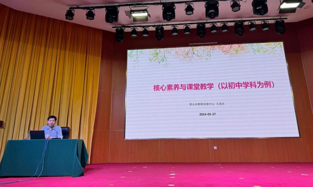 本网消息 5月—6月为师范学院人才培养高质量建设月,学院围绕“以学生为中心 推进人才培养高质量发展”主题开展一系列活动。05月27日晚,黄石市教育发展中心主任毛弟汉在豁度楼208报告厅作题为《核心素养与课堂教学(以初中学科为例)》的专题讲座,师范学院院长胡邦岳,教学主任刘燕及师范学院汉语言文学专业师生参加。