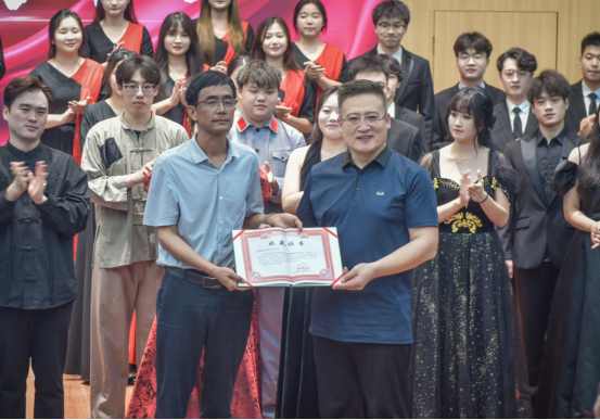音乐会上,艺术学院羽歌混声合唱团演唱的《小小阳新·万众一心》激昂澎湃、铿锵有力,那豪迈的旋律和坚定的歌声,犹如战鼓雷鸣,拉开了音乐会的序幕。随后《天天打胜仗》《送郎当红军》《戒赌歌》《喊一声红三军》《旧婚姻不自主》《鄂东南游击队歌》《庆祝克服大冶城》《五月榴花遍地开》《红三师授军旗歌》《慰劳红军》以及《鄂东南革命委员会歌》等革命民歌依次唱响。一首首革命歌曲里,凝聚着采录者费杰成、编配老师雷晓伟和毕业生王进林的无数心血。音乐会期间,国家一级档案馆、阳新县档案馆馆长周平海宣布对本场的音乐会实况影像进行永久收藏,并现场向艺术学院雷晓伟副院长颁发了收藏证书。