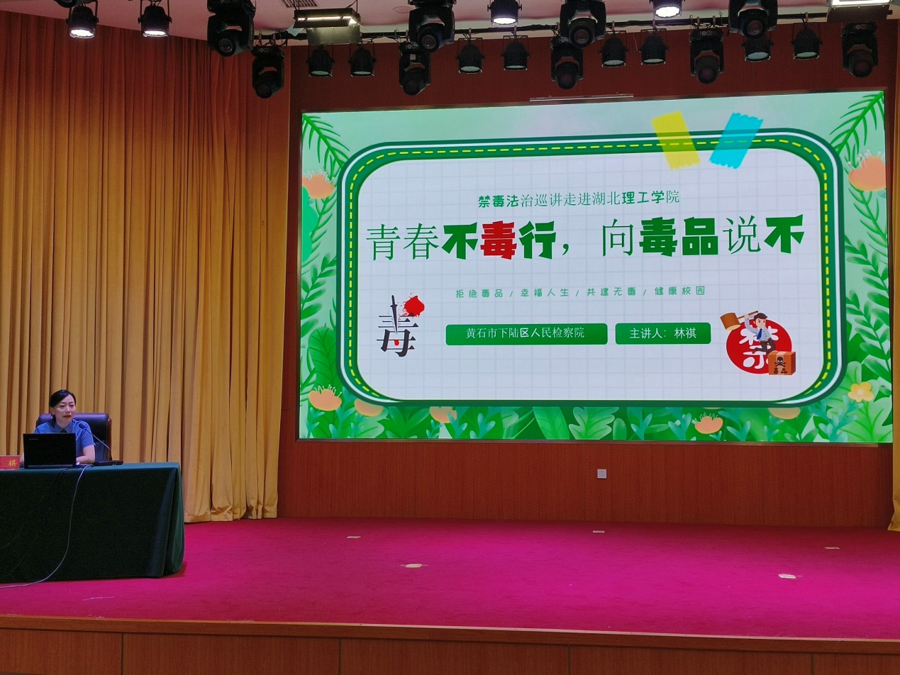 本网消息 在6·26国际禁毒日来临之际,6月25日下午,威尼斯官网保卫部邀请黄石市下陆区检察院、黄石市公安局下陆分局禁毒大队共同举办以“禁毒知识进校园,守护青春不“毒”行”为题的禁毒法治宣传教育讲座。各学院辅导员、学生代表300多人参加本次宣教活动,进一步推进毒品预防宣传教育工作,提高广大学生对毒品的认识和抵制毒品的能力,切实筑牢学生识毒防毒拒毒的思想防线。