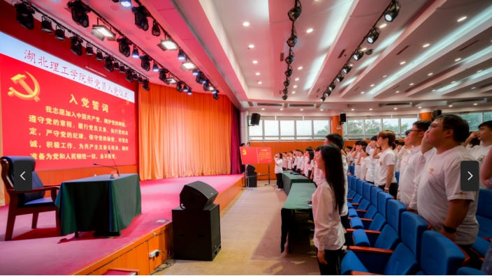 全体新发展党员及转正党员代表面向党旗,举起右手,在机电工程学院党员教师代表龚月的领誓下,庄严神圣地向党旗宣誓,表达对党的忠诚、为共产主义事业奋斗终身的决心。