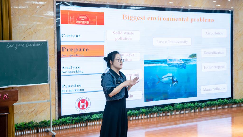 周哲老师在《理解当代中国:英语演讲》课程中,基于单元主题“绿色发展观”进行了精彩的展示。她结合习近平总书记主题演讲引导学生多维度理解中国的绿色发展观并结合“引人入胜”演讲开头方式学习,让学生通过主题演讲任务讲述中国绿色发展故事。该课程将具有思政元素的主题内容学习和演讲技能融合起来,引导学生更好地理解中国发展道路,树立四个自信,讲好中国故事,传播好中国声音!