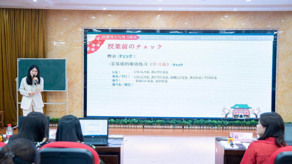 李璐老师展示了《大学日语》课程教学,秉持立德树人理念,运用情景式教学与项目式教学法,引导学生在各异场景中携疑而练,习“敬语”之表达与技巧,亲身领略“敬语”之魅力。课堂最后,学生进行分组讨论,归纳“敬语”的文化涵义及其与中国儒教文化之间的关系。授课不仅提升了学生“敬语”表达能力,更丰富其对“敬语”中儒教文化影响的理解,使学生深悟“敬语”文化中“礼”与“和”之伦理价值以及对现代生活的重要性。