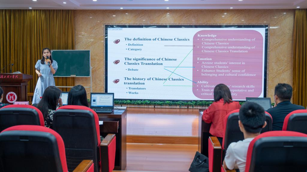 侯爽老师展示了《中华典籍海外传播》的课堂教学,教学设计中遵循相关(engaging),启发(elicitation)和多样(diversity)原则,进行相关主题讲解,提出启发性问题,设置多样性活动带领学生探索典籍知识。该课堂旨在培养学生批判性思维,提高学生文化归属感。
