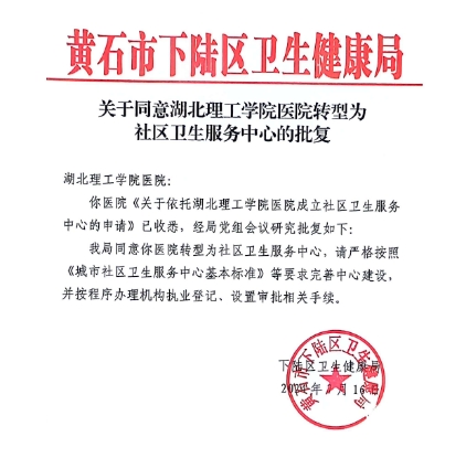 本网消息 7月16日,下陆区卫生健康局以批复的形式,同意校医院转型为社区卫生服务中心。