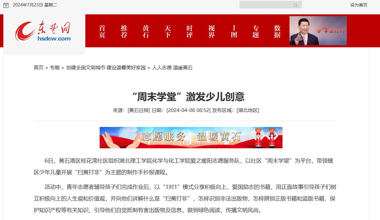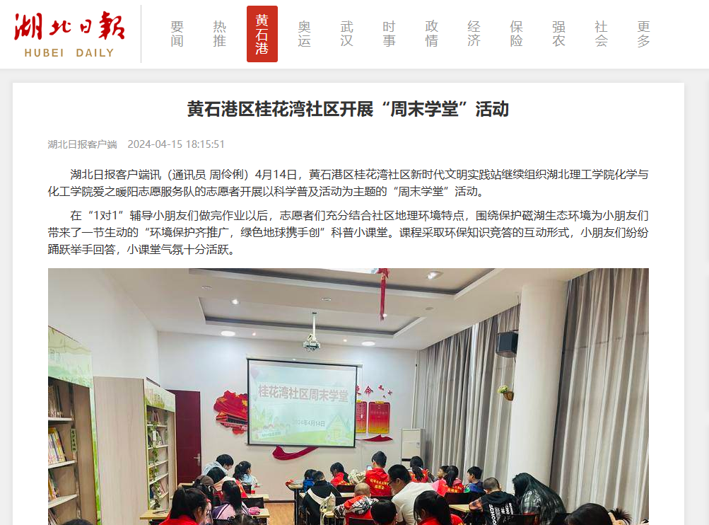 据悉,桂花湾社区的“暑期学堂”活动为“周末课堂”的重要组成部分。化工学院团总支充分挖掘学生社区的育人功能,积极促进双社区共建——大学生志愿者先在求实“一站式”学生社区进行专题教学培训及课程设计(启智引航者成长计划),社区再邀请培训合格的志愿者参与“周末课堂”活动。此外,“爱之暖阳”志愿服务大队在“周末课堂”实践活动中也多次被省市级媒体报道。(通讯员 苏涵琦 苏家兴)