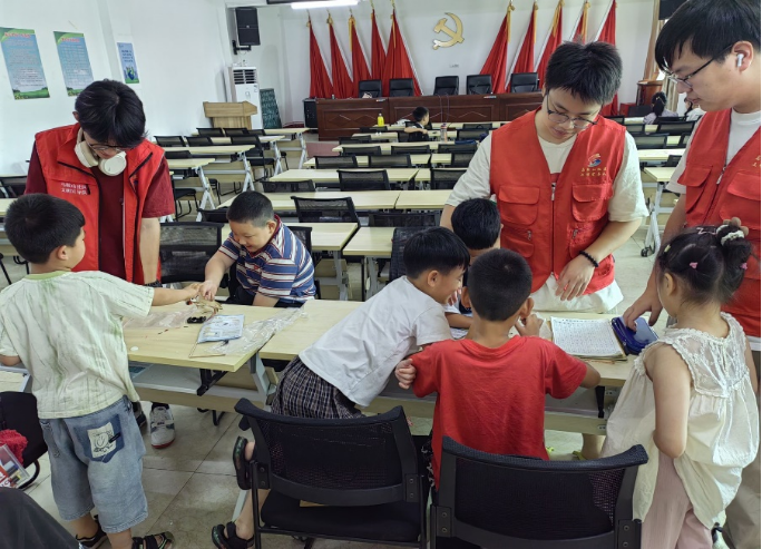 机电“微光”志愿服务队利用每周一、三、五的下午在马鞍山社区“暑假学堂”爱心托管班为社区儿童开展趣味实验课外实践活动。