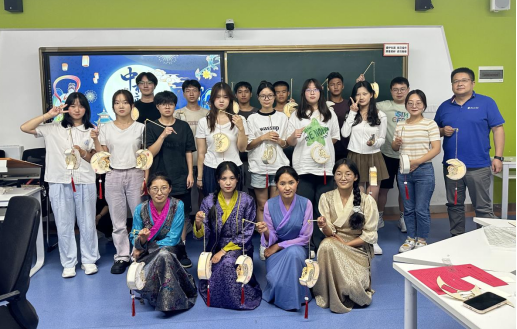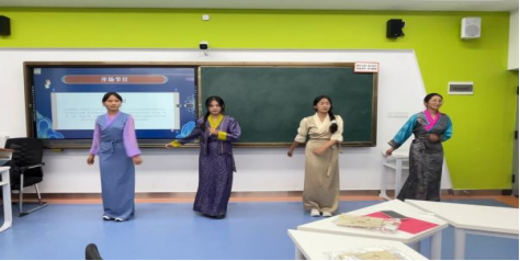 藏族学生格桑旺姆、次仁、旦增拉姆、边珍带来民族舞蹈《果谐》暖场,接着2024级少数民族新生代表以视频的方式用自己的民族语言祝福大家中秋节快乐,一片其乐融融!