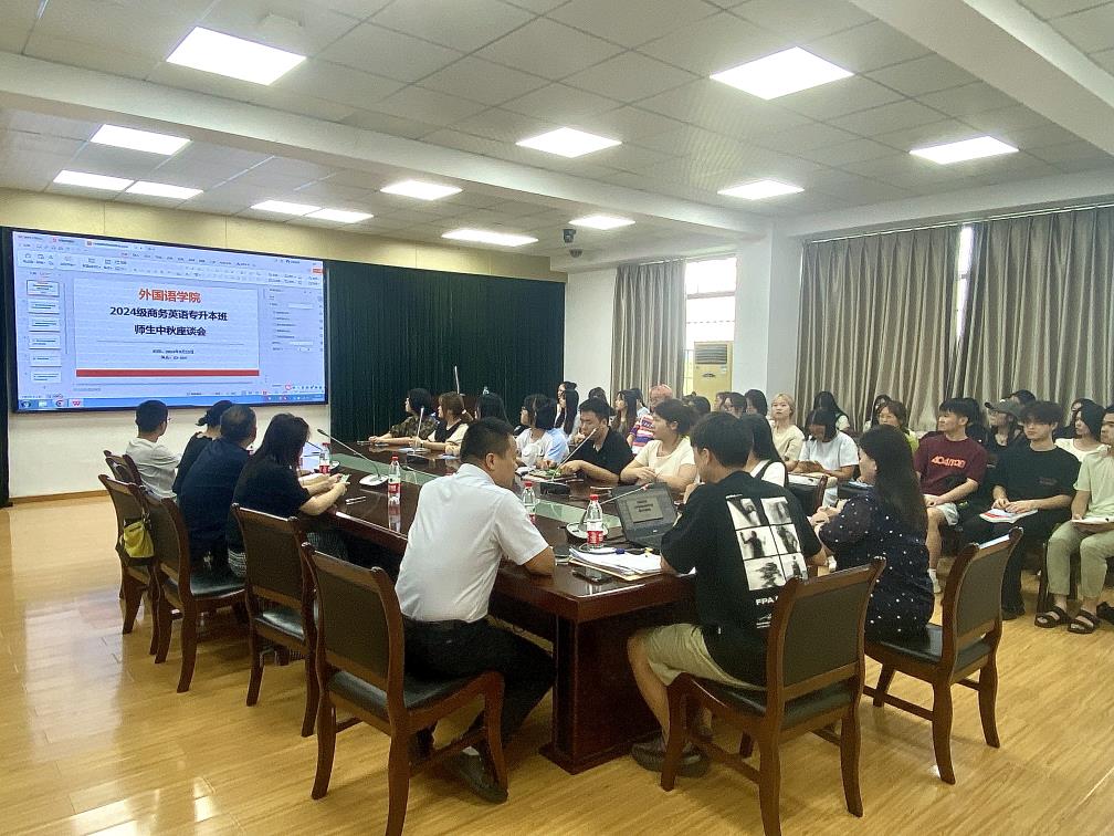本网消息 丹桂飘香,花好月圆,又是一年中秋至。在这个象征着团圆与和谐的美好时刻,9月13日,外国语学院在X2-304会议室举办了2024级商务英语专升本班师生中秋座谈会,共同庆祝这一传统节日。外国语学院领导班子,各科室负责人及50名学生代表参加会议。