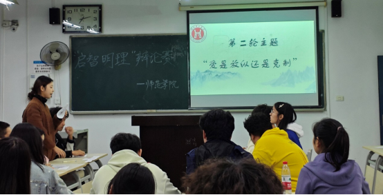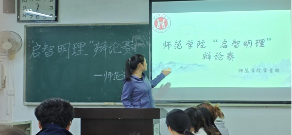 本网消息 10月24日,师范学院在J1-304教室举行“启智明理”辩论赛初赛。此次活动由团总支学竞部主办,学竞部副部长鲁璇主持,评委由高秀芳老师、张俊峰老师和学生会主席团成员担任。