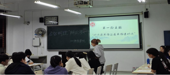 活动伊始,主持人介绍比赛规则,两轮辩手分别开始辩论,论题分别为“时代造英雄还是英雄造时代”“爱是放纵还是克制”。比赛现场气氛激烈紧张而热烈,双方辩手你来我往、“唇枪舌战”。他们引经据典,结合实践案例,对各自的观点进行深入剖析和有力辩驳。他们敏锐配合,交替辩驳,抓住对方辩论的弱点,迅速反击。最后,在评委团的认真评审和打分后,第一组正方(戢丽雅、王阳、周美赢、邹新月),第四组正方(郭晴、陈旭升、谭亚、刘思齐)进入决赛。