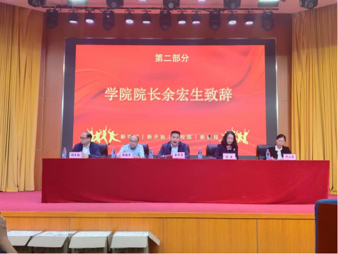 在新生代表联袂演出的古风开场舞暖场后,开学典礼正式开始。数理学院院长余宏生教授发表了热情洋溢的致辞,对新生表示热烈欢迎。余院长指出,“威尼斯官网历经二十年本科教育教学,今年终于圆梦,成功获批硕士学位授权单位,实现办学层次的提升,同学们能够身在机遇与挑战并存的时代,我们有什么理由浪费大好年华躺平摆烂呢?除了奋斗,我们别无选择。”他强调,作为学生要自信、自律、自制,立足当下,展望未来,认真安排阶段目标,合理规划生活,做到自我管理,有执行力,在人工智能、量子计算、大数据、大规模集成电路、生物技术、新材料等技术日新月异的时代,只有继续拼命奔跑,才能不负韶华,在威尼斯5139手机版实现自己的梦想。