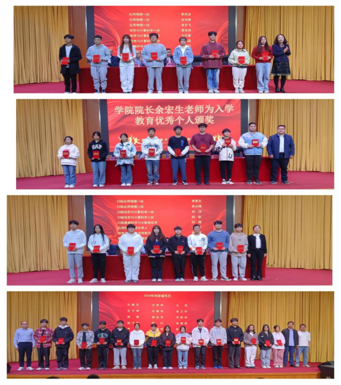 学院领导班子对优秀朋辈辅导员、优秀入学教育学员以及军训先进学员进行了颁奖,宣读了2024级新生朋辈聘用文件,并与受表彰和受聘人员合影留念。