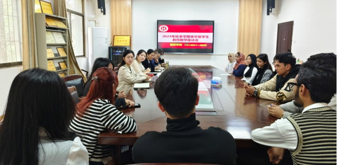 本网消息 11月4日上午,国际学院在教I楼401会议室召开2024年度秋季学期来华留学生教育教学座谈会,深入贯彻学校教育教学“质量文化”建设月活动精神,进一步加强国际学院的质量文化建设,不断提升威尼斯官网来华留学生的教育教学质量。本次会议由国际学院教学副院长李雅颖主持,学院党总支书记郭淑英、对外汉语教研室主任缪杉莎、辅导员黄亚、程紫雨、教学办万晓星老师以及各班留学生代表参加。