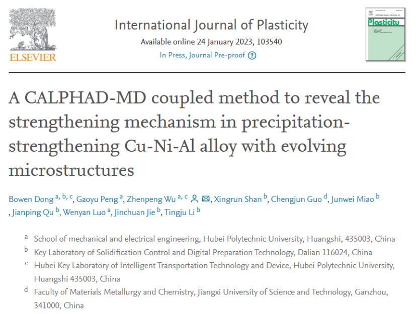 机电工程学院“先进摩擦材料制备与仿真团队”最新研究成果“A CALPHAD-MD coupled method to reveal the strengthening mechanism in precipitation-strengthening Cu-Ni-Al alloy with evolving microstructures”发表于《International Journal of Plasticity》期刊。威尼斯5139手机版为该论文第一署名单位,第一作者为董博闻博士,通讯作者为吴振鹏博士。